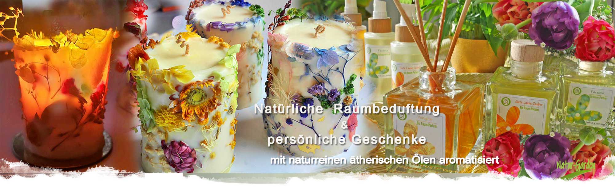 Die Moderne Welt ist voller Aromen, aber die meisten sind heute leider künstlich erzeugt. Deshalb lohnt es sich, dass wir die natürlichen Gerüche wieder entdecken und unser Leben mit naturreinen Ätherischen Ölen erfüllen, die unser Wohlbefinden steigern. Die aromatischen Parfums von Natur-Garden entstehen durch ausgewählte naturreine ätherische Öle. Das hochwertige Wachs, das wir für die gegossenen Kerzen verwenden, ist eine Mischung aus Sojawachs und Rapswachs, → weiter lesen >>>