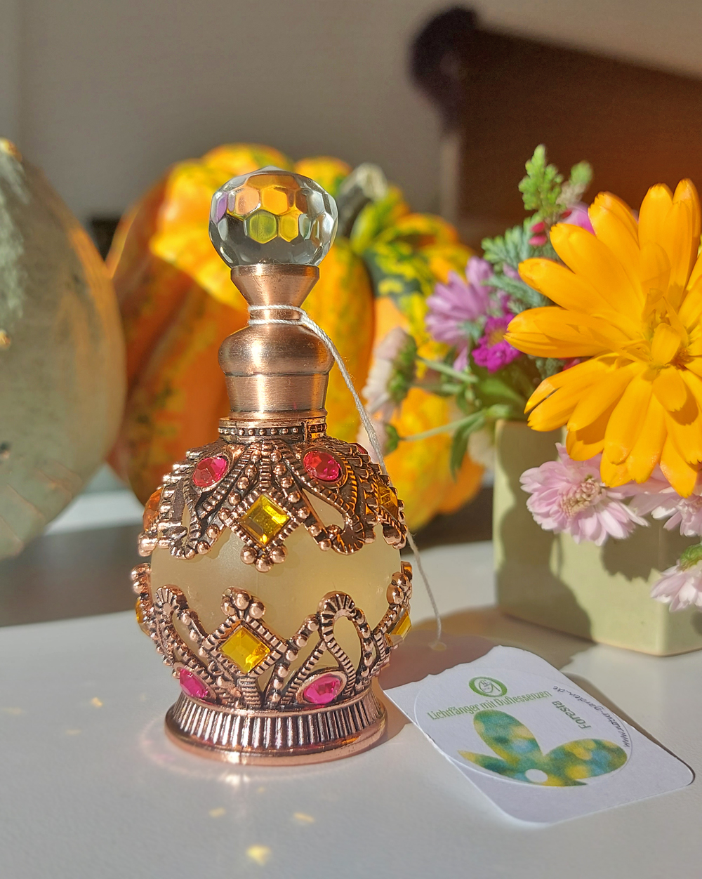 Lichtfänger, kleine dekorative Flakons mit Glaskristallen verziert, fangen das Sonnenlicht ein und erzeugen faszinierende Lichtregenbögen. Andererseits dienen sie zur Aufbewahrung von den von uns kreierten aromatischen Essenzen. Beim Öffnen zaubern sie sofort eine magische Atmosphäre.